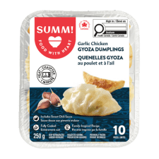 Chicken, Cabbage, Garlic, Green onion, Corn starch, Soy sauce (water, soybeans, wheat, salt), Salt, Sugar, Granulated garlic, Ginger, Sesame oil, Spices, Natural flavour.